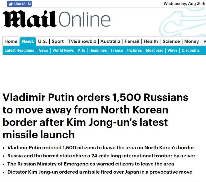 Η Ρωσία διέταξε την απομάκρυνση 1.500 πολιτών από τα σύνορα της με τη Βόρεια Κορέα μετά την εκτόξευση του βαλλιστικού πυραύλου από την Πιονγκγιάνγκ, σύμφωνα με τη Daily Mail.