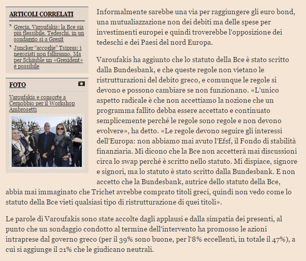Σύμφωνα με την εφημερίδα, κατά την παρέμβασή του, ο Έλληνας υπουργός δήλωσε ότι το καταστατικό της Ευρωπαϊκής Κεντρικής Τράπεζας έχει γραφτεί από την Bundesbank, ότι οι κανόνες του δεν απαγορεύουν την αναδιάρθρωση του ελληνικού χρέους και ότι «αν οι κανόνες αποδεικνύονται μη λειτουργικοί, πρέπει να μπορούν, πάντως, να αλλάζουν».