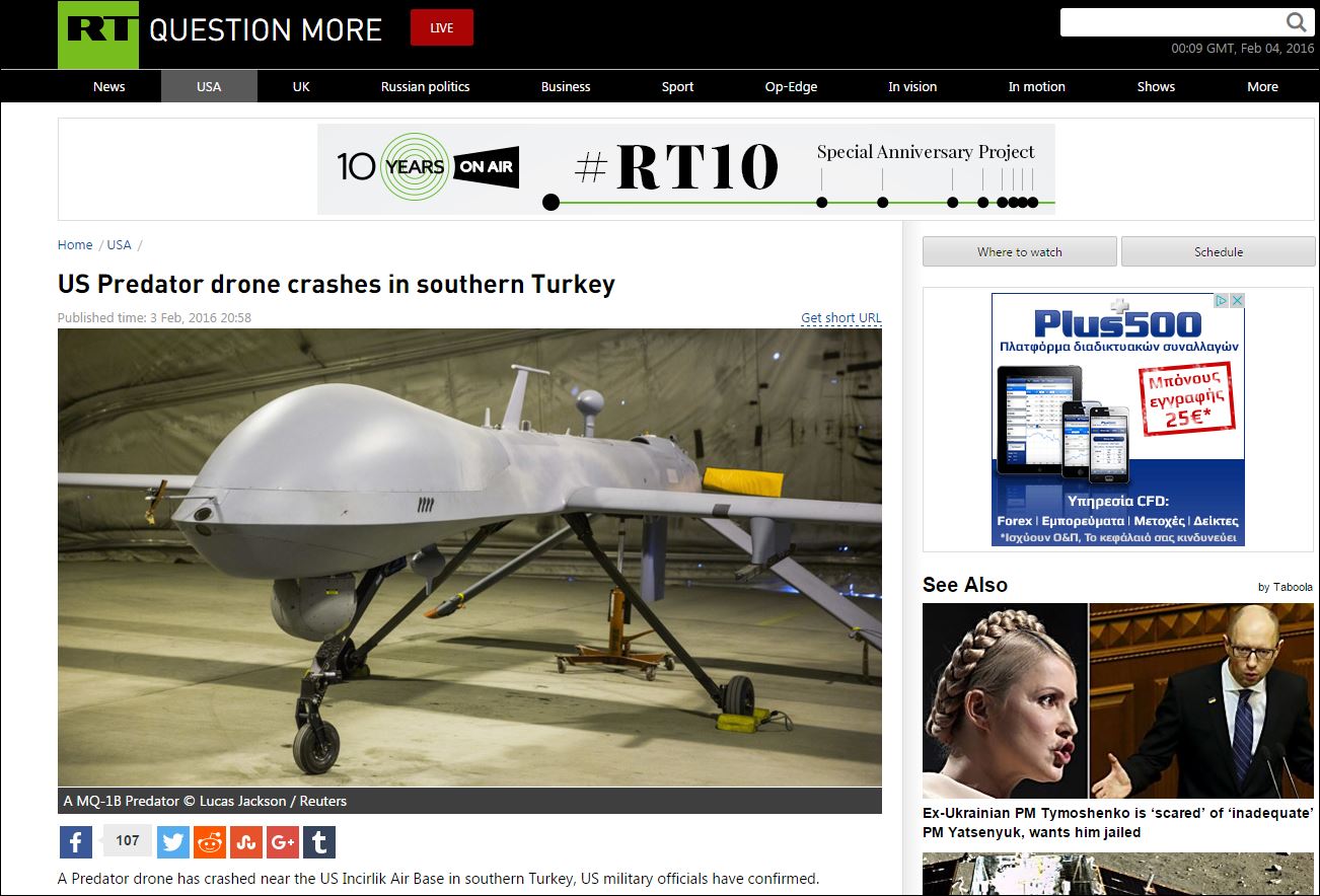 Σύμφωνα με το ρεπορτάζ της ιστοσελίδας, «Russian Today», το drone έπεσε κοντά στο Ντογκανκέντ, που βρίσκεται στα 15 χιλιόμετρα από τα Άδανα με την εκπρόσωπο Τύπου των αεροπορικών δυνάμεων των ΗΠΑ στην Ευρώπη, Λόρεν Οτ να μην αποκαλύπτει στοιχεία για την αποστολή του.