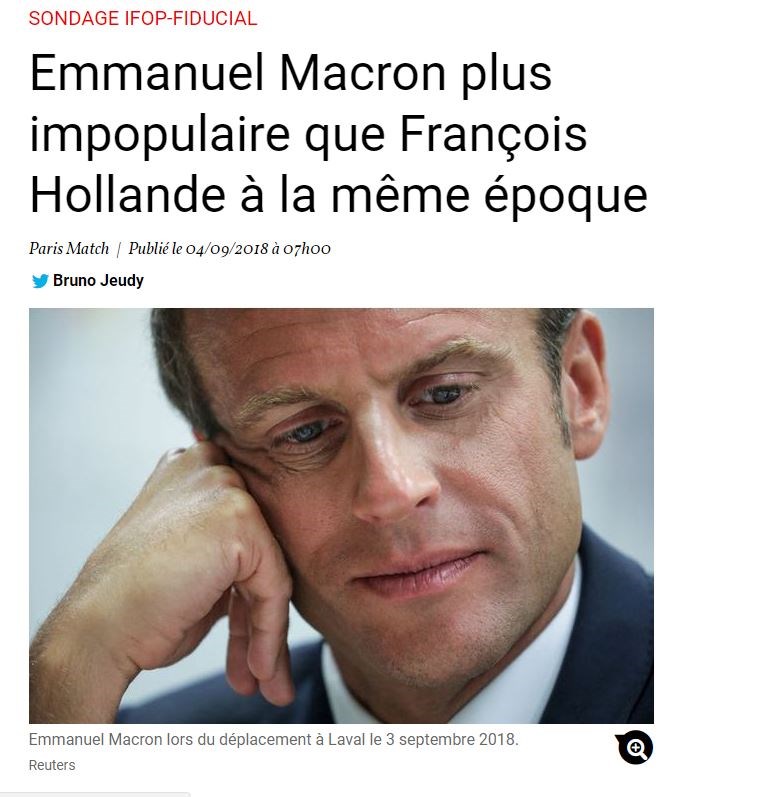Στη δημοσκόπηση του Ifop ο Μακρόν εμφανίζει ποσοστό χαμηλότερο από του σοσιαλιστή προκατόχου του Φρανσουά Ολάντ (32%) κατά την ίδια περίοδο της θητείας του, τον Σεπτέμβριο του 2013.