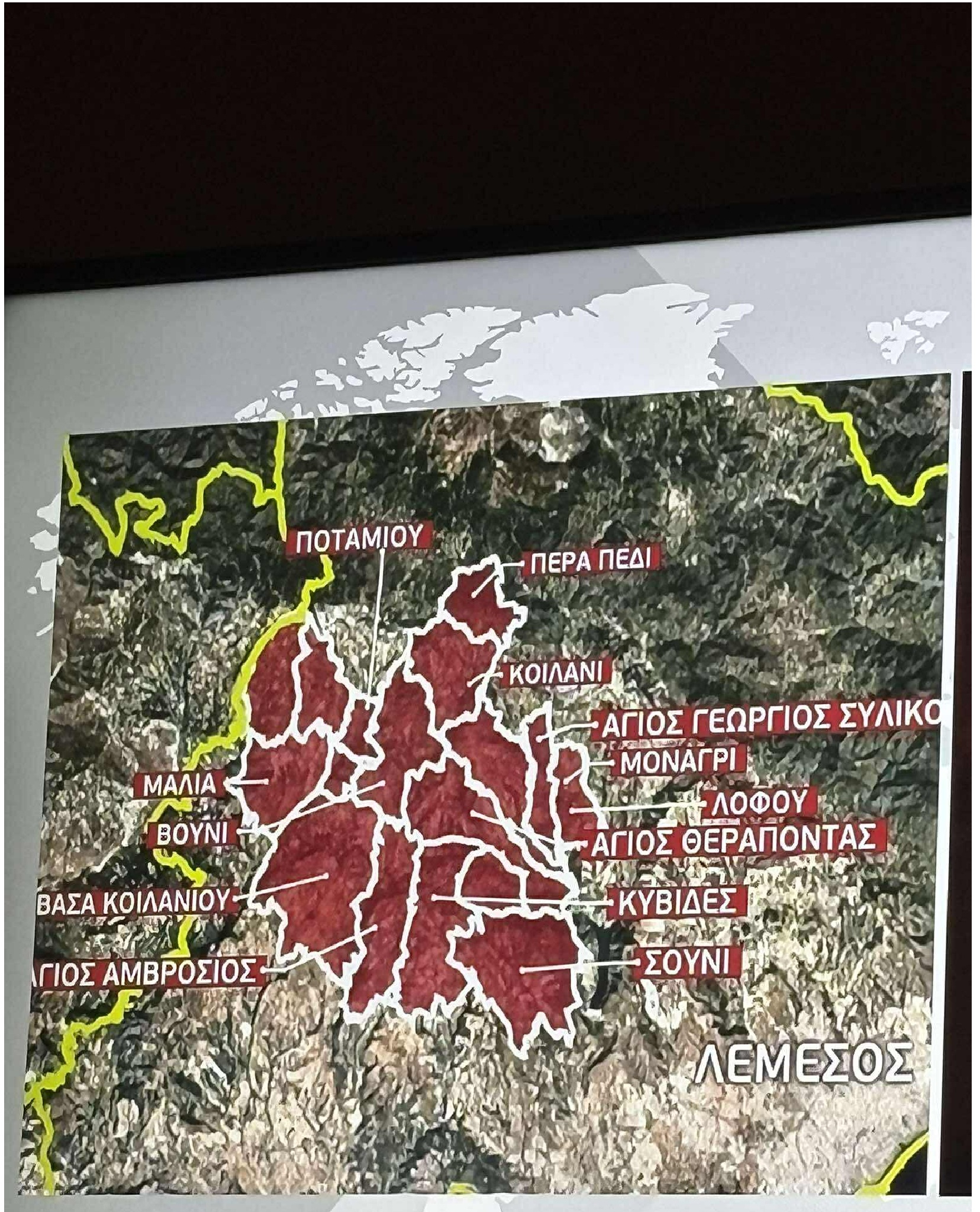 Σύμφωνα με το alphanews, στο έλεος της πύρινης λαίλαπας βρέθηκαν οι κοινότητες Μαλιά, Όμοδος, Βάσα, Άρσος, Ποταμιού, Λόφου, Άγιος Γεώργιος Συλίκου, Βουνί, Άγιος Αμβρόσιος, Κυβίδες, Σούνι, Καντού. Μέχρι τη δύση του ηλίου, επιχειρούσαν από αέρος 14 πτητικά μέσα, ενώ οι επίγειες δυνάμεις συνεχίζουν τη μάχη καθ’ όλη τη διάρκεια της νύχτας.
