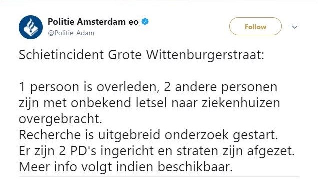 Επεισόδιο με πυροβολισμούς σημειώθηκε απόψε στην Γκρότε Βιτενμπούργκερστράατ, στο Άμστερνταμ και η αστυνομία επιβεβαίωσε ότι υπάρχει ένας νεκρός και δύο τραυματίες.