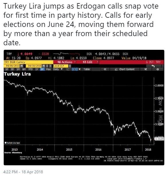 «Ανάσα» πήρε η τουρκική λίρα μετά την ανακοίνωση του Τούρκου Προέδρου Ρετζέπ Ταγίπ Ερντογάν για πρόωρες εκλογές στις 24 Ιουνίου.