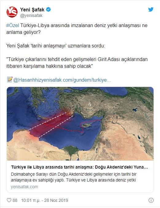 “Με τη συμφωνία η προσπάθεια της Ελλάδας να εισβάλλει στη Μεσόγειο θα πέσει στο κενό ενώ Τουρκία και Λιβύη θα αποκτήσουν θαλάσσιες αρμοδιότητες στην περιοχή νότια της Κρήτης και γύρω από την Κύπρο”, σημειώνει η φιλο-κυβερνητική τουρκική εφημερίδα, προσθέτοντας ότι “μετά τις εξελίξεις στην ανατολική Μεσόγειο γίνεται ακόμη πιο επιτακτική η ανάγκη της οριοθέτησης θαλάσσιων ζωνών μεταξύ Τουρκίας και Λιβύης”.