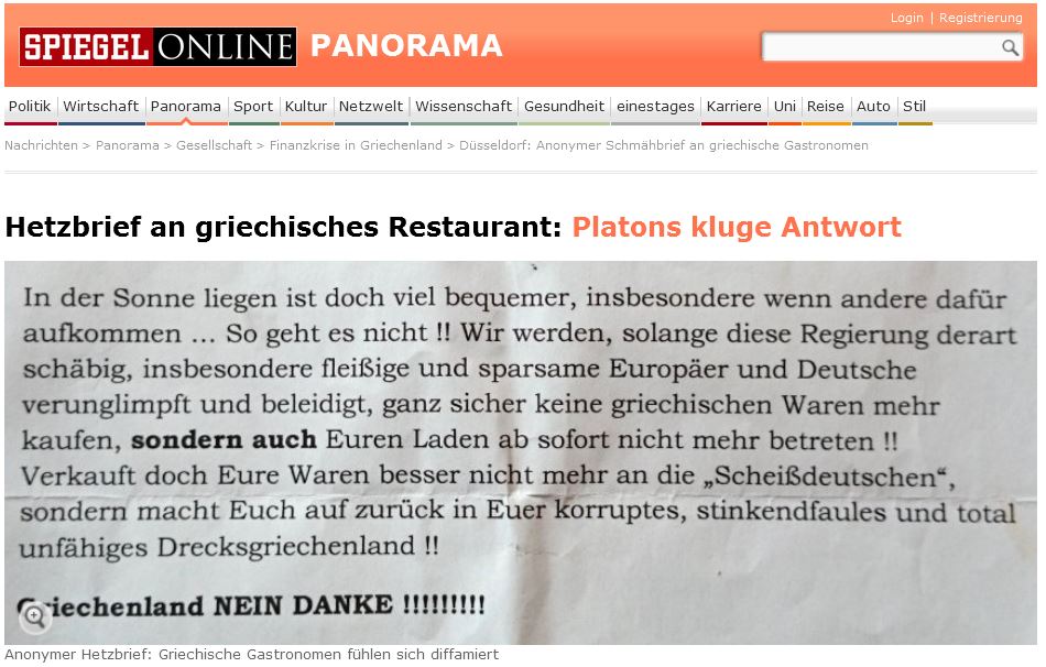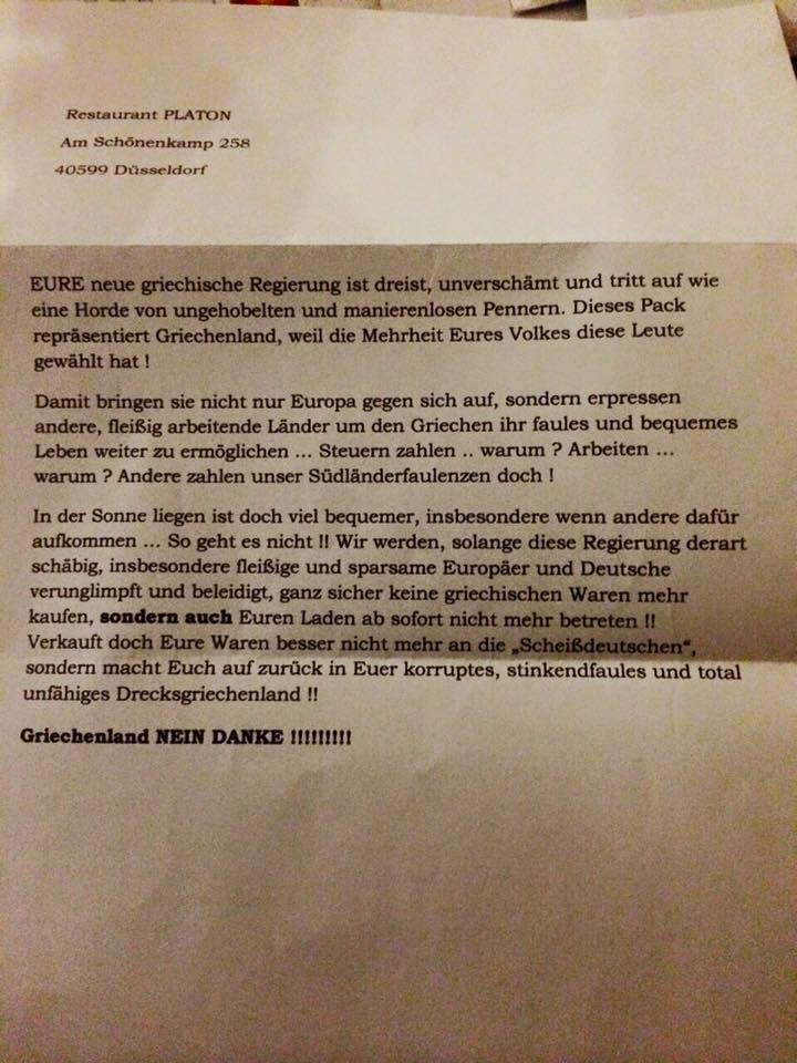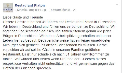 «Η οικογένειά μας λειτουργεί εδώ και 31 χρόνια το εστιατόριο Platon στο Ντίσελντορφ. Ζούμε στην Γερμανία και νιώθουμε δεμένοι με τη Γερμανία. Μιλάμε Γερμανικά, γράφουμε Γερμανικά και πληρώνουμε τους φόρους μας όπως όλοι οι Γερμανοί πολίτες. Έχουμε δημιουργήσει θέσεις εργασίας και έχουμε χτίσει τη ζωή μας εδώ. Δυστυχώς ένας δειλός, αμόρφωτος πολίτης μας έστειλε αυτό το γράμμα. Είναι πολύ άσχημο μετά από 31 χρόνια να αισθάνεσαι ανεπιθύμητος. Θα ήμασταν ευτυχισμένοι αν οι φίλοι των Ελλήνων δεν στηρίξουν τέτοιες ασεβείς συμπεριφορές και να ενώσουμε τις φωνές μας κατά της παρακίνησης μίσους εναντίον των Ελλήνων».