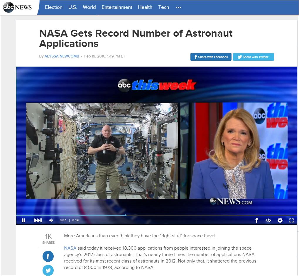 Σύμφωνα με ανακοίνωση της NASA, τα ξημερώματα του Σαββάτου η NASA έχει δεχθεί από τώρα για την κλάση του 2017 18.300 αιτήσεις από ανθρώπους, οι οποίοι εκτιμούν πως μπορούν να ταξιδέψουν στο διάστημα. Και για να καταλάβει κανείς το μέγεθος του αριθμού, αρκεί να πάει στην κλάση του 2012, όπου ήταν τρεις φορές μικρότερη. Οσο για το ρεκόρ αιτήσεων σε προγράμματα φοίτησης της NASA ήταν το 1978, όπου υπήρξαν 8.000 άτομα που κατέθεσαν αίτηση.