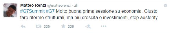 Σε ανάρτησή του στον προσωπικό του λογαριασμό του Twitter, δε, ο Ιταλός πρωθυπουργός έγραψε: «καλό το πρώτο μέρος των εργασιών του G7 για την οικονομία. Σωστό να γίνουν δομικές μεταρρυθμίσεις, αλλά χρειάζεται περισσότερη ανάπτυξη και επενδύσεις, στοπ με την λιτότητα».