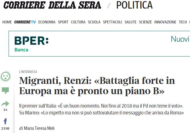 Απαντώντας στον πρόεδρο των Ιταλών βιομηχάνων Τζόρτζιο Σκουίντσι ότι «είναι αποκαρδιωτικό η Ιταλία να μην καλείται, πλέον, σε σημαντικές ευρωπαϊκές συναντήσεις για την Ελλάδα», ο Ρέντσι επισημαίνει: