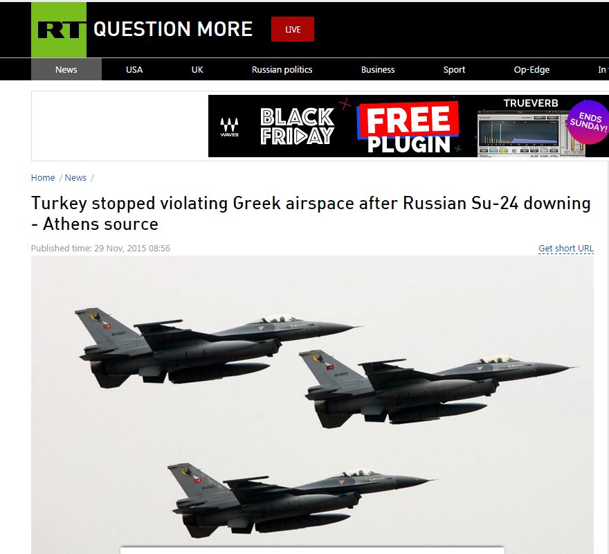 Το Ρωσικό δίκτυο Russia Today, σε δημοσίευμά του τονίζει ότι η Τουρκία σταμάτησε να παραβιάζει τον ελληνικό εναέριο χώρο μετά την κατάρριψη του ρωσικού μαχητικού.