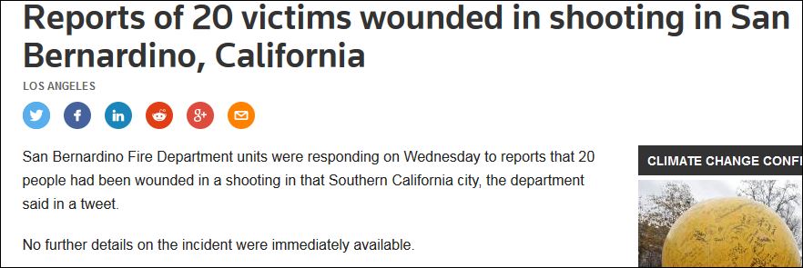 Όπως μετέδωσε πριν από λίγο το Reuters σύμφωνα με πληροφορίες 20 άτομα έχουν τραυματιστεί από τους πυροβολισμούς ενόπλου στο Σαν Μπερναρντίνο της Καλιφόρνια.