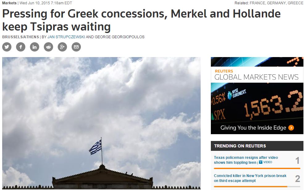 Κοντά σε αδιέξοδο βρίσκονται Ελλάδα – δανειστές με τη Μέρκελ και τον Ολάντ να κρατούν στο περίμενε τον Τσίπρα για συνάντηση το βράδυ πιέζοντας για παραχωρήσεις αναφέρει το Reuters.