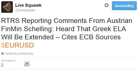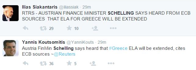 Σύμφωνα με το Reuters, ο υπουργός Οικονομικών της Αυστρίας, Γεργκ Σέλινγκ, «βλέπει» αύξηση του ELA, επικαλούμενος πηγές της Ευρωπαϊκής Κεντρικής Τράπεζας.