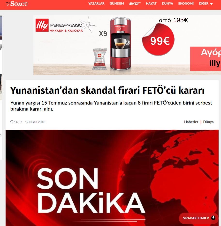 Στο ίδιο ύφος με τη Hurriyet κινείται και το «sozcu.com.tr» που κάνει λόγο για «σκανδαλώδη απόφαση στην Ελλάδα».