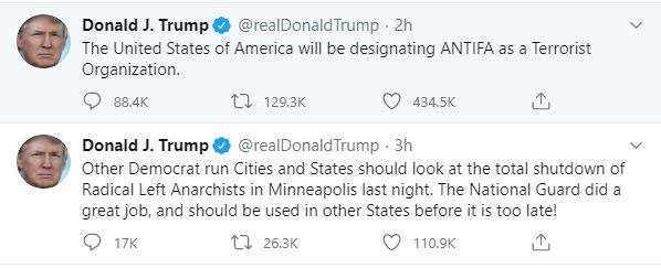 «Οι ΗΠΑ θα κηρύξουν τους ANTIFA τρομοκρατική οργάνωση», ανακοίνωσε με tweet ο Ντόναλντ Τραμπ, ο οποίος επιρρίπτει στο κίνημα αυτό και άλλους «ριζοσπάστες εξτρεμιστές» τις ταραχές που ξεσπούν κατά τη διάρκεια ειρηνικών διαδηλώσεων για τη δολοφονία του Τζορτζ Φλόιντ από λευκούς αστυνομικούς. Με σειρά αναρτήσεων στο Twitter, ο Τραμπ συνεχάρη τις δυνάμεις ασφαλείας που κατάφεραν να ελέγξουν χθες το βράδυ την κατάσταση στην Μινεάπολις.