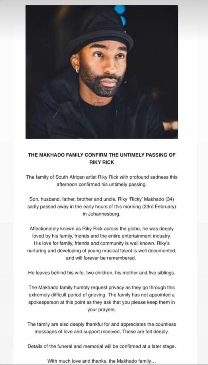 Στην ανακοίνωση της οικογένειάς του αναφέρεται μεταξύ άλλων: “Γιος, σύζυγος, πατέρας, αδελφός και θείος, ο Riky ‘Ricky’ Makhado δυστυχώς έφυγε από τη ζωή το ξημέρωμα της 23ης Φεβρουαρίου στο Γιοχάνεσμπουργκ” όπως και “η αγάπη για την οικογένεια, τους φίλους και την κοινότητα είναι γνωστή. Ο Riky ανέπτυξε από μικρός μουσικό ταλέντο και θα τον θυμόμαστε για πάντα”