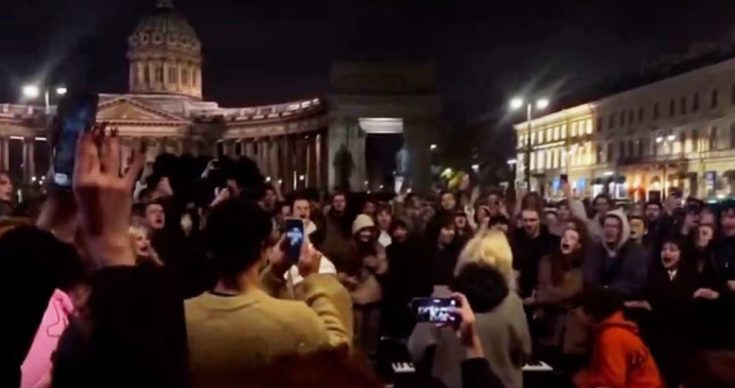 Εκατοντάδες Ρώσοι ζήτησαν την ανατροπή του Βλαντίμιρ Πούτιν από την εξουσία σε μια σπάνια αντικυβερνητική διαδήλωση, στην Πετρούπολη (Πόλη του Αγίου Πέτρου) όπου ένα τεράστιο πλήθος εθεάθη να ενώνεται με μουσικούς του δρόμου στην πλατεία Καζάνσκαγια για να τραγουδήσει απαγορευμένους αντιπολεμικούς στίχους.