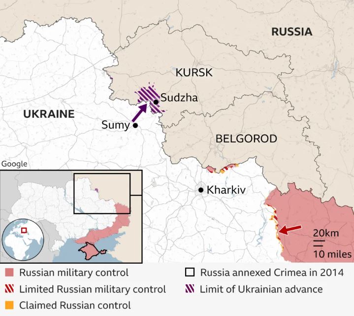 Όπως μεταδίδει το BBC, τα ουκρανικά στρατεύματα έχουν, προελάσει έως και 30 χιλιόμετρα στη ρωσική περιοχή του Κουρσκ. Σχεδόν 200.000 άνθρωποι απομακρύνθηκαν από περιοχές κατά μήκος των συνόρων από τη ρωσική κυβέρνηση. Μετά από μια εβδομάδα, ο ανώτατος διοικητής της Ουκρανίας ισχυρίστηκε ότι ελέγχει 1.000 τετραγωνικά χιλιόμετρα ρωσικού εδάφους, αν και αναλυτές υποστήριξαν ότι η πραγματική κλίμακα εναι μικρότερη. Οι περιοχές του Κουρσκ και του Μπέλγκοροντ έχουν κηρύξει -και οι δύο- κατάσταση έκτακτης ανάγκης.