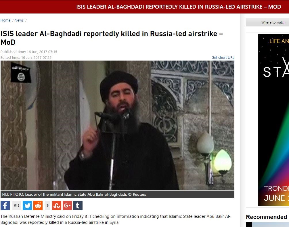Το ρωσικό υπουργείο Άμυνας ανακοίνωσε την Παρασκευή ότι ελέγχει πληροφορίες που αναφέρουν ότι ο αρχηγός του ISIS Αμπού Μπακρ αλ-Μπαγντάντι έπεσε νεκρός σε αεροπορική επίθεση που πραγματοποίησε η Ρωσία στη Συρία.