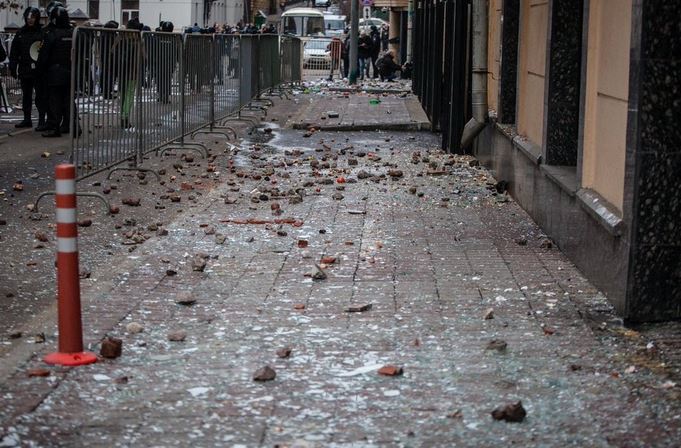 Υλικές ζημιές προκλήθηκαν στο κτίριο της πρεσβείας και αστυνομία προχώρησε σε συλλήψεις.
