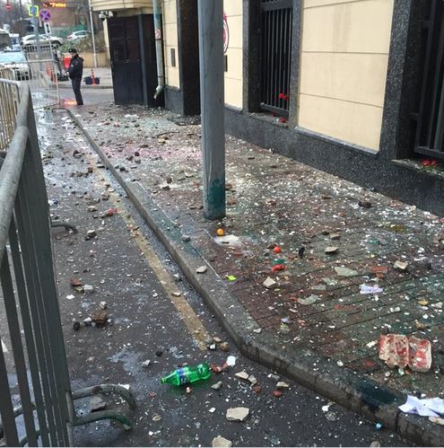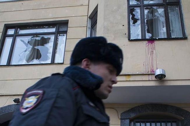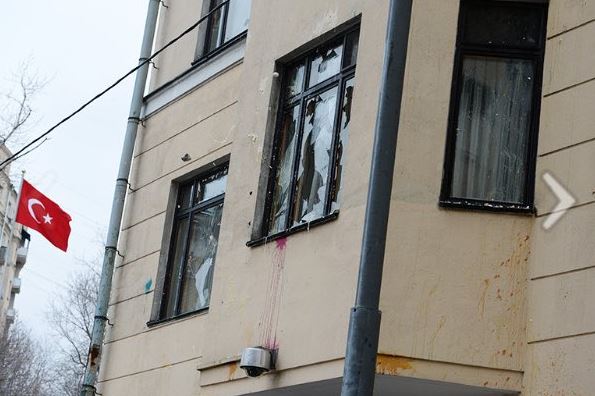 Διαδηλωτές πέταξαν αυγά και πέτρες στην τουρκική πρεσβεία στη Μόσχα μία ημέρα μετά την κατάρριψη του ρωσικού μαχητικού από τα τουρκικά F-16.
