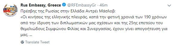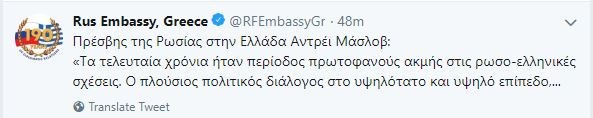 “Τα τελευταία χρόνια ήταν περίοδος πρωτοφανούς ακμής στις ρωσο-ελληνικές σχέσεις. Ο πλούσιος πολιτικός διάλογος στο υψηλότατο και υψηλό επίπεδο, το Αφιερωματικό έτος Ρωσία – Ελλάδα 2016, το κοινό Έτος Τουρισμού 2017/2018, στενές επαφές αρμόδιων υπουργείων, επιχειρηματιών και κοινωνίας των πολιτών”, ανέφερε σε ανάρτησή του στο Twitter, o Πρέσβης της Ρωσίας στην Ελλάδα Αντρέι Μάσλοβ.