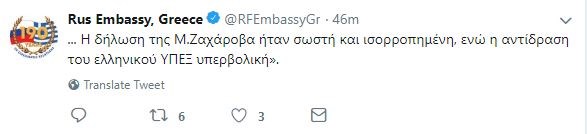 “Οι κινήσεις της ελληνικής πλευράς, κατά την φετινή χρονιά των 190 χρόνων από την ίδρυση των διπλωματικών μας σχέσεων και της 25ης επετείου του θεμελιώδους Συμφώνου Φιλίας και Συνεργασίας, έχουν γίνει απογοήτευση για μας. Η δήλωση της Μ. Ζαχάροβα ήταν σωστή και ισορροπημένη, ενώ η αντίδραση του ελληνικού ΥΠΕΞ υπερβολική”, πρόσθεσε ο Ρώσος Πρέσβης.