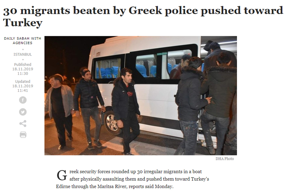Σύμφωνα με την Daily Sabah, οι μετανάστες από το Πακιστάν, το Αφγανιστάν και την Αλγερία συνελήφθησαν από τις τουρκικές Αρχές, στην περιοχή της Αδριανούπολης και υποστήριξαν ότι οι Έλληνες Αστυνομικοί τους χτύπησαν και τους έβαλαν ξανά στη βάρκα με την οποία είχαν φτάσει σε ελληνικό έδαφος, για να επιστρέψουν στην Τουρκία.