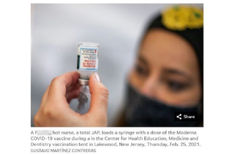 Μία γκάφα ολκής έκανε η τρίτη μεγαλύτερη καθημερινής κυκλοφορίας εφημερίδα του Νιου Τζέρσεϊ, προκαλώντας σάλο μέσα στο σαββατοκύριακο. Αιτία η λεζάντα σε μία φωτογραφία που χαρακτηρίστηκε τόσο μισογυνική όσο και ρατσιστική: “Μία γαμ@@@@να καυτή νοσοκόμα, εντελώς Γιαπωνέζα, γεμίζει μία σύριγγα με δόση από το εμβόλιο της Moderna κατά του κορονοϊο” αναγραφόταν μεταξύ άλλων στη λεζάντα. Στο ήδη προσβλητικό κείμενο, υπήρχε και ο ρατσιστικός χαρακτηρισμός “a total JAP”, εντελώς Γιαπωνέζα, δηλαδή. Η φωτογραφία αποδίδεται στον Γουστάβο Μαρτίνες Κοντρέρας, και συνόδευε κείμενο υπό το όνομά του σχετικά με τις προσπάθειες να φέρουν το εμβόλιο σε έγχρωμους στο Τζέρσεϊ Σορ.