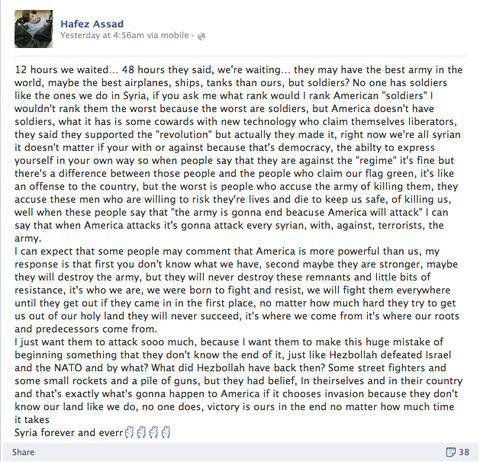 Στη σελίδα του ο γιος του Μπασάρ Αλ Άσαντ γράφει ότι: «Η Αμερική δεν έχει στρατιώτες, έχει κάτι δειλούς με νέα τεχνολογία που θεωρούν τους εαυτούς τους απελευθερωτές», ενώ στη συνέχεια τονίζει ότι «Θέλω τοοόσο πολύ να επιτεθούν, γιατί θέλω να κάνουν αυτό το τεράστιο λάθος να ξεκινήσουν κάτι που δεν ξέρουν το τέλος του».