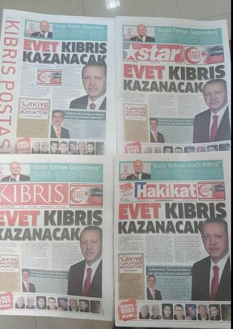 Ποικίλες αντιδράσεις και σχόλια, κυρίως αρνητικά, έχει προκαλέσει το πληρωμένο πρωτοσέλιδο υπέρ του “ναι” στο δημοψήφισμα της 16ης Απριλίου, που φιλοξενήθηκε σε τέσσερις τουρκοκυπριακές εφημερίδες, την Kibris, την Kibris Postasi, την Star και την Hakikat.Στα μέσα κοινωνικής δικτύωσης η κριτική είναι έντονη, καθώς κάτι τέτοιο συμβαίνει για πρώτη φορά στον τουρκοκυπριακό Τύπο. Μάλιστα, οι φήμες οργιάζουν καθώς εικάζεται ότι η “τιμή” για τα εν λόγω πρωτοσέλιδα είναι μερικές χιλιάδες ευρώ. «Πουλήθηκαν οι εφημερίδες στον Ερντογάν και το ΑΚΡ αλλά και δεν υπάρχουν πλέον όρια», είναι μερικά από τα σχόλια που γίνονται στο διαδίκτυο. Στο πληρωμένο πρωτοσέλιδο – διαφήμιση υπάρχει ο τίτλος “Ναι η Κύπρος θα κερδίσει” με την φωτογραφία του Τούρκου Προέδρου, Ταγίπ Ερντογάν και δήλωση που έκανε παλαιότερα για το ψευδοκράτος, τονίζοντας ότι εάν διαφυλάξουν την ενότητα Τουρκίας – ψευδοκράτους και το πνεύμα αλληλεγγύης “δεν υπάρχει εμπόδιο που δεν μπορούμε να ξεπεράσουμε”. Γίνεται αναφορά στη στήριξη της Τουρκίας στον τουρκοκυπριακό “λαό”, την μητέρα πατρίδα Τουρκία και αναφορά στον Αλλάχ. “Αγαπιόμαστε για τον Αλλάχ, έτσι θα συνεχίσουμε να αγαπιόμαστε. Αυτό το έθνος (μιλιέτ που είναι το έθνος με έμφαση στην θρησκευτική ιδιότητα) πέρασε τα πλοία από τη στεριά, αυτό το έθνος έχτισε το Μαρμαράι (σ.σ. υποθαλάσσιο τρένο) κάτω από το Βόσπορο. Αυτό το έθνος έφερε το νερό από το Αναμούρ στη βόρεια Κύπρο”.Προβάλλεται επίσης δήλωση του Τούρκου Πρωθυπουργού, Μπιναλί Γιλντιρίμ ότι “δυνατή Τουρκία είναι δυνατή Κύπρος”, αλλά και δήλωση του εκπροσώπου του ΑΚΡ στο παράρτημα του κόμματος στα κατεχόμενα, του κ. Ντεμιρτζί ότι “με μια σταθερή Τουρκία η Κύπρος θα συνεχίσει να υπάρχει”. Και στους δύο υπάρχουν αναφορές στις σχέσεις αδελφότητας Τουρκίας – ψευδοκράτους και επίκληση του Αλλάχ.“Αυτή τη φορά ο Αλλάχ μας έδωσε την ευκαιρία να πούμε ΝΑΙ για την Τουρκία”, αναφέρει ο Ντεμιρτζί.Στο πρωτοσέλιδο υπάρχει και φωτογραφία με τη σημαία του ψευδοκράτους στον Πενταδάκτυλο, το σύνθημα μέσα σε μισοφέγγαρο “Ναι η Κύπρος θα κερδίσει” και γράφει ότι η “ΤΔΒΚ” – όπως αναφέρει το ψευδοκράτος – παρ` όλα τα εμπάργκο έχει πει ναι στο να συνεχίσει να υπάρχει.Στο κάτω μέρος της σελίδας υπάρχουν διάφορα πρόσωπα ανθρώπων που έχουν ταχθεί υπέρ του “ναι” και στην εσωτερική σελίδα εξηγούν με σύντομες δηλώσεις γιατί “λέω ναι με όλη μου την καρδιά για την Κύπρο”.Να σημειωθεί ότι η ψηφοφορία για τους Τούρκους στα κατεχόμενα ξεκινά στις 5 Απριλίου και θα διαρκέσει μέχρι τις 9 του μήνα.Για την καμπάνια του “όχι” στα κατεχόμενα φέρεται να βρέθηκε και ο πρώην βουλευτής του ΡΛΚ, Ουμούτ Οράν.ΠΗΓΗ: ΚΥΠΕ