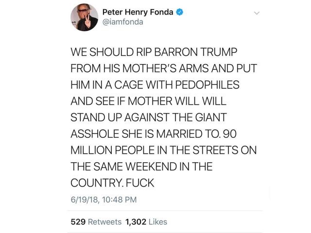 Σάλο έχει προκαλέσει ένα tweet του ηθοποιού Πίτερ Φόντα, ο οποίος ανέφερε πως ο μικρός γιος του Ντόναλντ Τραμπ, Μπάρον θα έπρεπε να χωριστεί από την μητέρα του και να τον βάλουν σε ένα κλουβί με παιδεραστές.
