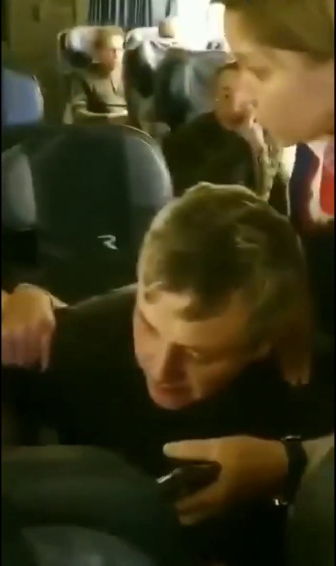 Στο βίντεο που αναρτήθηκε στα social media, μία αεροσυνοδός παρεμβαίνει και τους φωνάζει να σταματήσουν “βάλε το πέος σου μέσα στο παντελόνι σου, αμέσως τώρα” φωνάζει στον άνδρα και απευθυνόμενη στη γυναίκα της δίνει εντολή να αφήσει το μόριο του ερωτικού της παρτενέρ αμέσως.