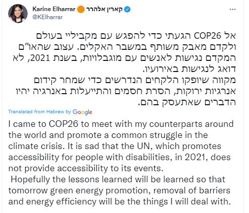 Η υπουργός Ενέργειας του Ισραήλ αποκάλυψε ότι δεν κατάφερε να παρευρεθεί στη Διάσκεψη του ΟΗΕ για το Κλίμα την πρώτη ημέρα, καθώς δεν υπήρχε προσβασιμότητα για άτομα με αναπηρία. Όπως είπε, περίμενε δύο ώρες στο κρύο μπροστά από το κέντρο εκδηλώσεων στη Γλασκώβη, καθώς δεν υπήρχε προσβασιμότητα για το αναπηρικό αμαξίδιό της.