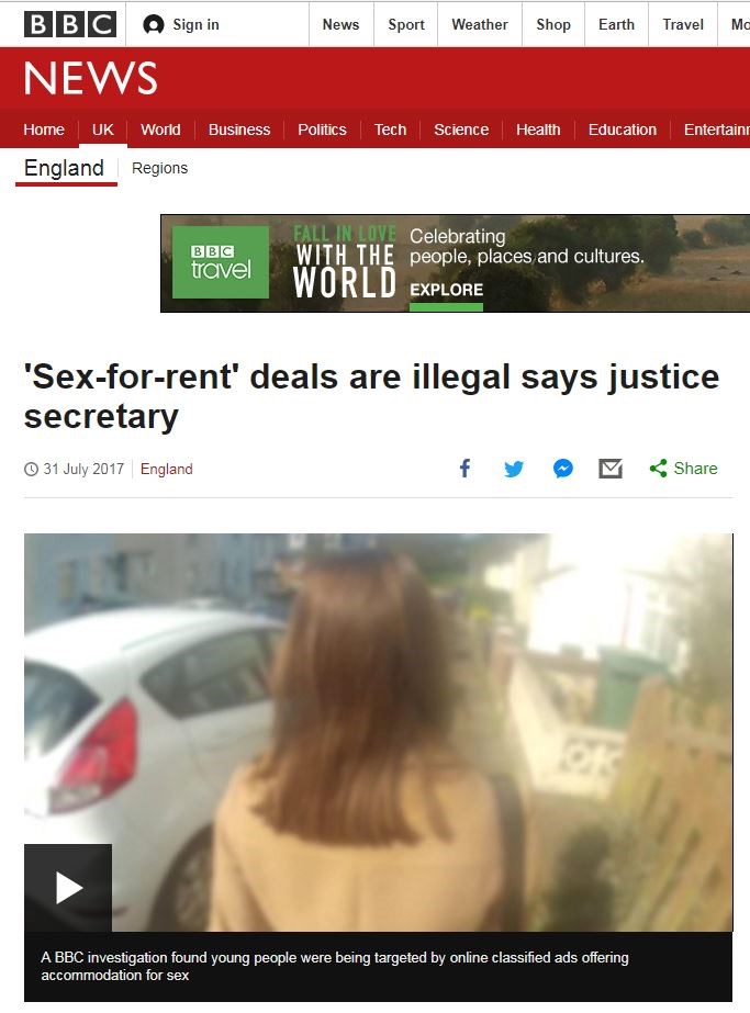 «Σεξ αντί για ενοίκιο» ζητούν όλο και περισσότερες αγγελίες στο διαδίκτυο, στη Βρετανία. Σύμφωνα με έρευνα του BBC, αρκετές νέες αγγελίες διαμονής αναζητούν νεαρά κυρίως άτομα, στα οποία παραχωρείται στέγη με αντάλλαγμα σε «είδος» αντί για ενοίκιο. Οι αγγελίες αυτές στοχεύουν κυρίως σε ευάλωτα νεαρά άτομα, τα οποία εύκολα μπορούν να πειστούν και να ενδώσουν. Το φαινόμενο αυτό εμφανίζεται ολοένα και περισσότερο, ιδιαίτερα σε φτωχές περιοχές της Βρετανίας, όπως αναδεικνύει η έρευνα του BBC.Σημειώνεται πως οι συμφωνίες αυτές δεν έχουν κριθεί παράνομες, καθώς υπάρχει συναίνεση του ενοικιαστή, ωστόσο υπέρμαχοι των δικαιωμάτων των πολιτών θεωρούν πως πρόκειται για εκμετάλλευση ευάλωτων ατόμων, ενώ ο βουλευτής Πίτερ Κάιλ έχει ζητήσει την απαγόρευση των αγγελιών αυτών.