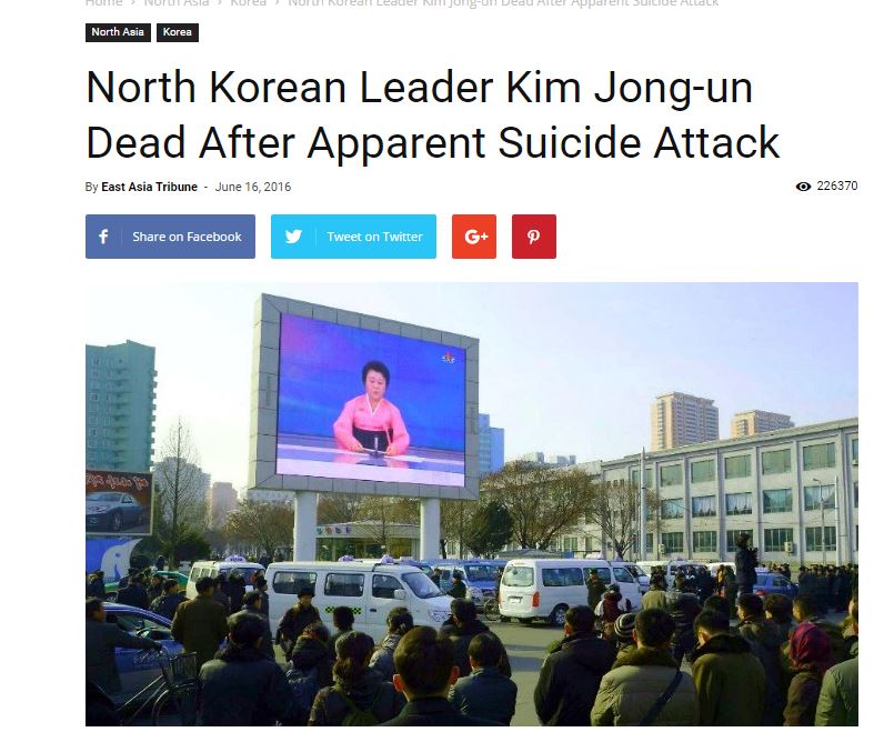 Συγκεκριμένα, η East Asia Tribune, ανήρτησε ένα άρθρο, στο οποίο αναφερόταν ότι ο ο Κιμ Γιονγκ Ουν σκοτώθηκε σε μια βομβιστική επίθεση αυτοκτονίας.