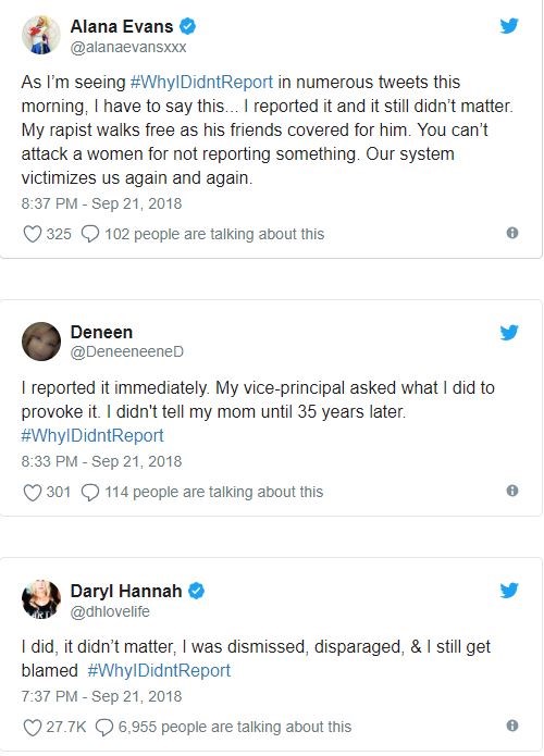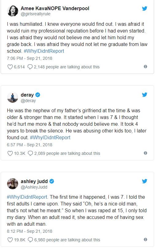 Ο Αμερικανός πρόεδρος Ντόναλντ Τραμπ, επικρίνοντας την Κριστίν Μπλάζι Φορντ, τη γυναίκα που κατηγορεί τον υποψήφιο για το Ανώτατο Δικαστήριο Μπρετ Κάβανο για σεξουαλική επίθεση, ότι περίμενε χρόνια για να το καταγγείλει, προκάλεσε θύελλα στο Twitter με το hashtag #WhyIDidntReport (γιατί δεν το κατήγγειλα) να γίνεται viral στις ΗΠΑ.