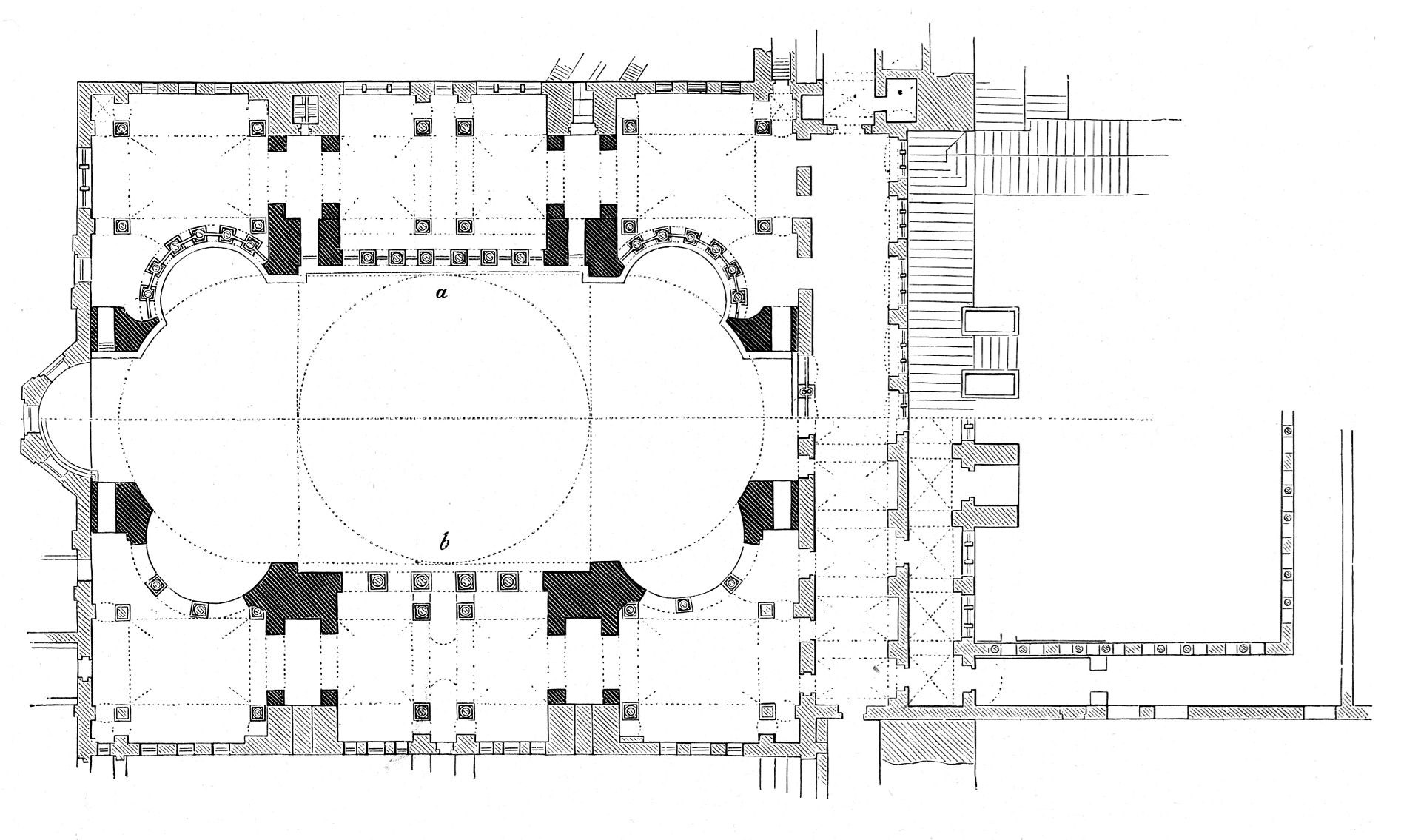 Στο σημείο υπήρχε ομώνυμος ναός κτισμένος επί Κωνσταντίνου Α΄ και Κωνσταντίνου Β΄, ο οποίος, όμως, κάηκε κατά τη Στάση του Νίκα το 532 μ.Χ. Τα θυρανοίξια του ιερού ναού έγιναν στις 27 Δεκεμβρίου 537 μ.Χ., ενώ λέγεται ότι χιλιάδες ζώα σφάχτηκαν και διανεμήθηκαν, μαζί με σιτάρι και ψωμί, στον κόσμο στο πλαίσιο των πολυήμερων εορτασμών.