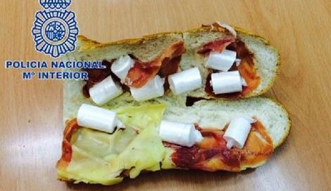 Μια φωτογραφία που έδωσαν στη δημοσιότητα οι ισπανικές αρχές απεικονίζει ένα κομμάτι ψωμί κομμένο στα δύο, ενώ μέσα του διακρίνονται φέτες ζαμπόν και τυριού όπως και 9 μικρά κυλινδρικά πακέτα λευκού χρώματος, τυλιγμένα προσεκτικά με πλαστικό, όπου είχαν κρυφτεί τα ναρκωτικά.
