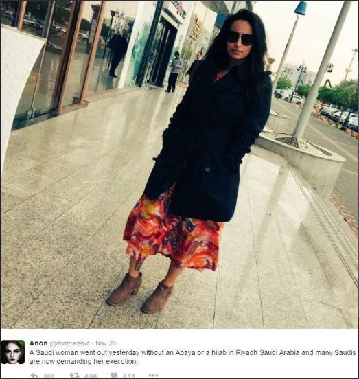 Η γυναίκα «ανήρτησε ένα tweet εμφανίζοντας τον εαυτό της να στέκεται χωρίς μπούρκα κοντά σε ένα πολύ γνωστό καφέ στο Ριάντ», συμπλήρωσε ο εκπρόσωπος, κατηγορώντας επίσης την γυναίκα «ότι μίλησε ανοιχτά για απαγορευμένες σχέσεις της με άνδρες», με τους οποίους δεν είχε συγγένεια.