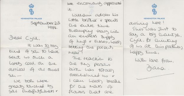 Σε ένα που έγραψε πέντε ημέρες μετά τη γέννηση του Χάρι, στις 20 Σεπτεμβρίου 1984, η Νταϊάνα ανέφερε: «Ο Ουίλιαμ λατρεύει τον μικρό αδελφό του και περνάει όλον του τον χρόνο πλημμυρίζοντας τον Χάρι με ατελείωτες αγκαλιές και φιλιά, επιτρέποντας μόλις και μετά βίας στους γονείς να πλησιάσουν!”. Το σημείωμα αυτό πουλήθηκε έναντι 3.200 λιρών, ενώ η αρχική εκτίμηση ήταν 400-600 λίρες.