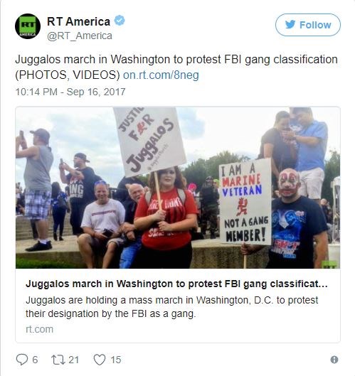 Η ειρωνεία είναι ότι μια άλλη ομάδα hip hop που διαδήλωνε μπροστά απ’ το Lincoln Memorial εκεί κοντά, κατάφερε να προσελκύσει περισσότερα άτομα. Πρόκειται για οπαδούς του γκρουπ Insane Clown Posse, που αυτοαποκαλούνται Juggalos και διαμαρτύρονταν επειδή το FBI τους κατέταξε σε λίστα με συμμορίες.