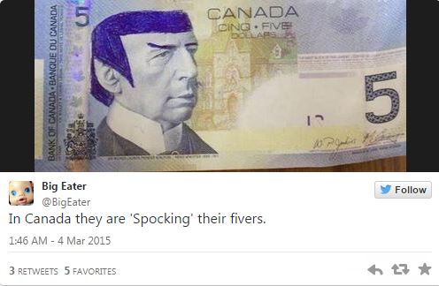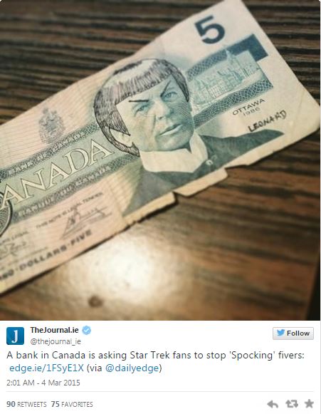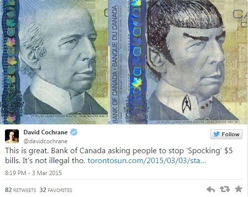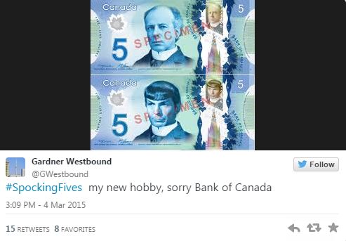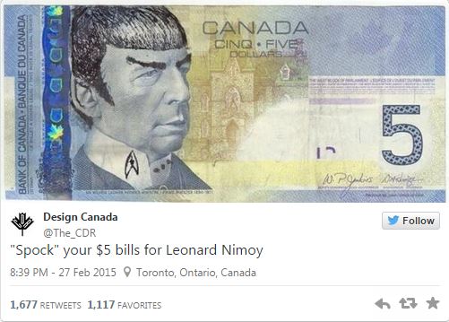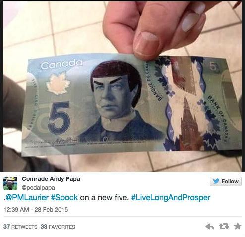 Πήραν το χαρτονόμισμα των 5 δολαρίων και μετέτρεψαν τον εικονιζόμενο πρωθυπουργό σερ Βίλφριντ Λοριέ, στον ήρωα του Star Trek. Προφανώς διαπίστωσαν ότι υπάρχουν αρκετές ομοιότητες.