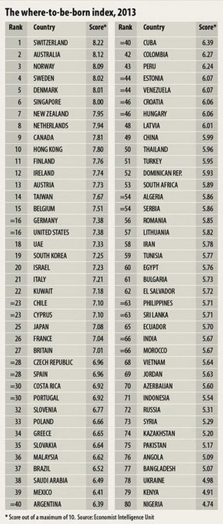 Σύμφωνα με τη νέα έρευνα του η Ελβετία είναι πλέον, η περισσότερο ενδεδειγμένη χώρα του κόσμου, για να γεννηθεί σήμερα ένα παιδί. Η έρευνα πραγματοποιήθηκε από τη Μονάδα Πληροφοριών του περιοδικό. Οι επόμενες δύο καλύτερες χώρες του κόσμου για να γεννηθεί ένα παιδί είναι η Αυστραλία και η Νορβηγία ενώ η Ελλάδα βρίσκεται στην 34η θέση. Στο μικροσκόπιο της έρευνας μπήκαν 80 χώρες παγκοσμίως