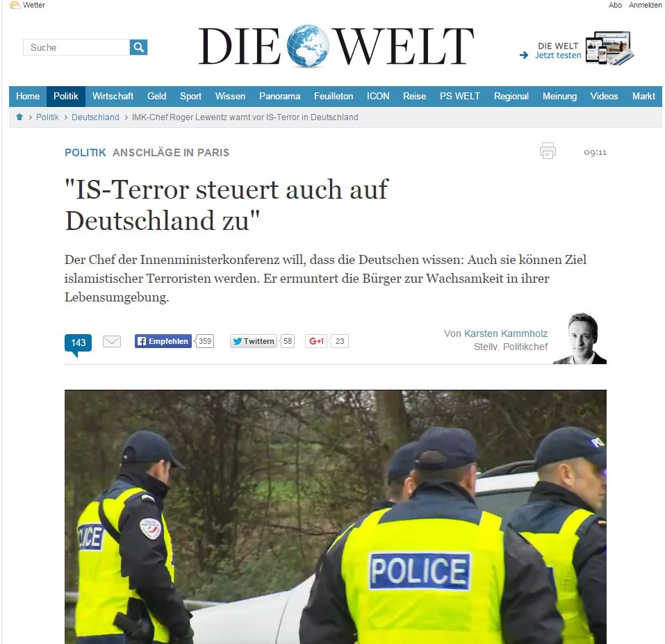 Εξάλλου σε σημερινή συνέντευξή του στην εφημερίδα Die Welt ο Λεβέντς κάλεσε τους Γερμανούς πολίτες να είναι προσεκτικοί μετά τις επιθέσεις στο Παρίσι.