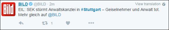 Οι γερμανικές αρχες, εντόπισαν δύο νεκρούς , κατά την έφοδό τους στο υπόγειο του δικηγορικού γραφείο στη Στουγκάρδη, όπου νωρίτερα εισέβαλε ένας ένοπλος, κρατώντας ομήρους.