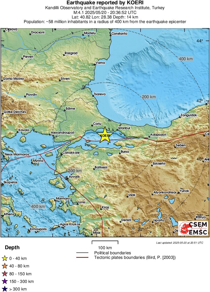 Σεισμός μεγέθους 4 βαθμών της κλίμακας Ρίχτερ σημειώθηκε στη Θάλασσα του Μαρμαρά, με επίκεντρο ανοικτά των ακτών του Μπουγιούτσκμετζέ, στα νοτιοδυτικά της Κωνσταντινούπολης.
