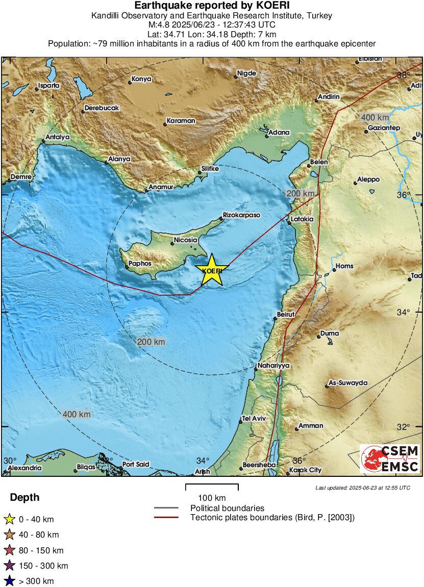 Σεισμός 4,3 βαθμών της κλίμακας Ρίχτερ σημειώθηκε το μεσημέρι της Δευτέρας 23 Ιουνίου 2025 ανοιχτά της Κύπρου.