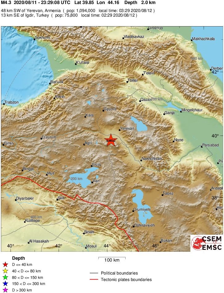 Σεισμική δόνηση 4,3 βαθμών της κλίμακας Ρίχτερ σημειώθηκε στην ανατολική Τουρκία. Σύμφωνα και με το Ευρωμεσογειακό Σεισμολογικό Κέντρο, ο σεισμός σημειώθηκε στις 02:29 τοπική ώρα, στην περιοχή Ιγκντίρ, στα ανατολικά της χώρας.