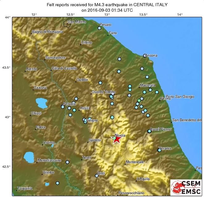 Σεισμική δόνηση 4,3R σημειώθηκε στις 1.34 π.μ. ώρα Ελλάδας στην Ιταλία, η οποία μετρά ακόμη τις πληγές της έπειτα από τον φονικό σεισμό των 6,2R.
