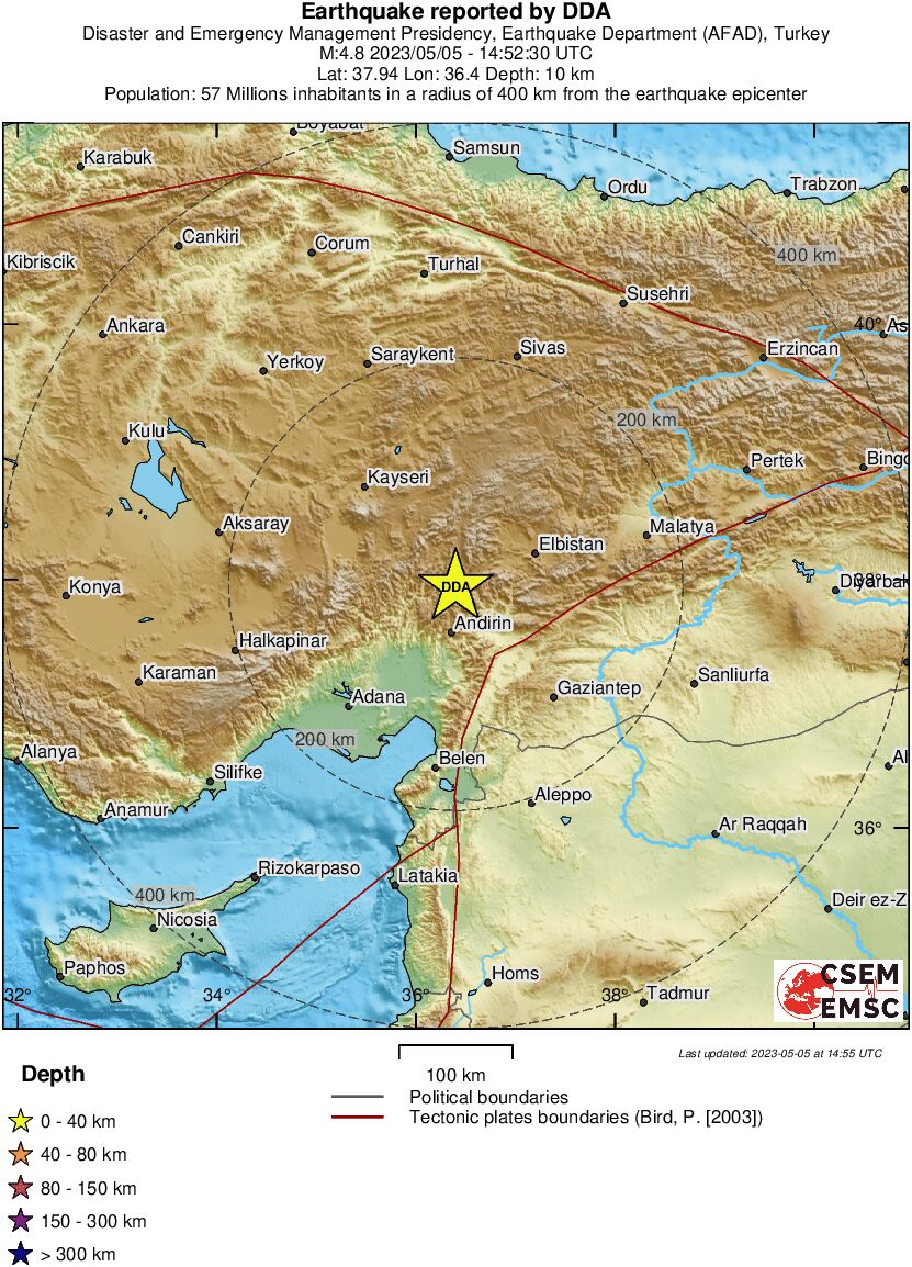 Σεισμός μεγέθους 4,7 βαθμών της κλίμακας Ρίχτερ σημειώθηκε στις 17.52 στο Καχραμανμαράς, στην Τουρκία.